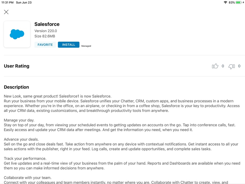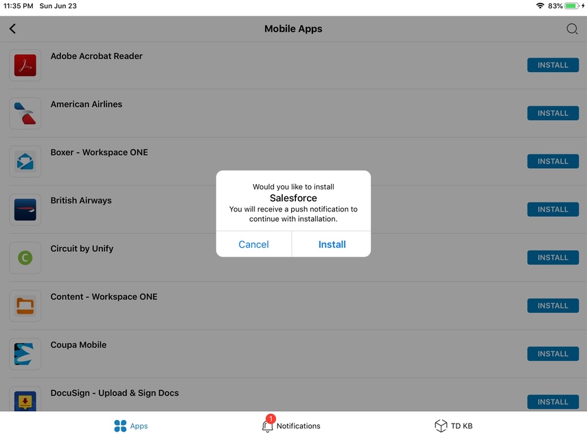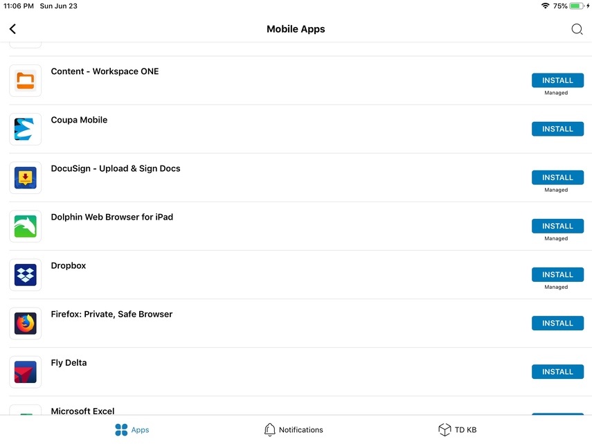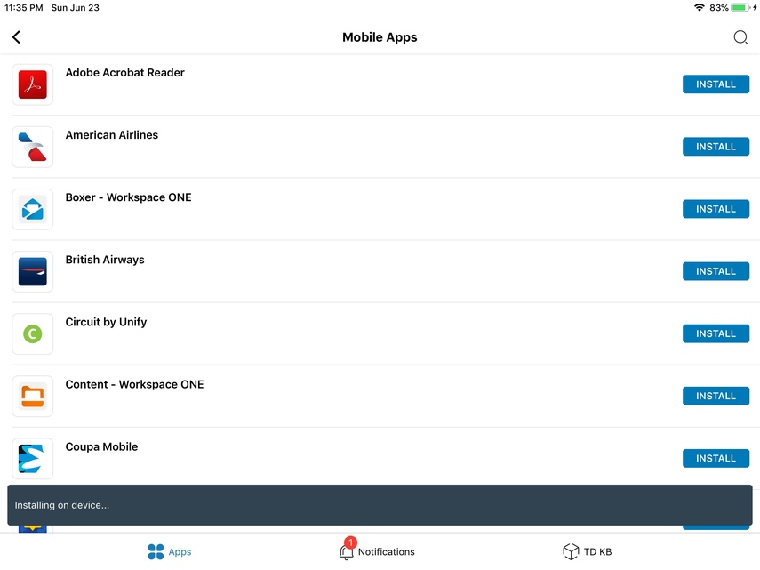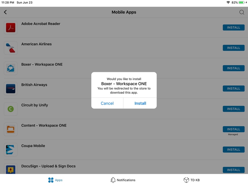Now you have successfully installed the Workspace Services profile and you will be able to access all apps, even ones that were previously locked. Next, you'll be brought to install the app you were attempting to install previously. See that it no longer contains a 'Managed' label. Click Install and the app will begin installing on the native springboard.