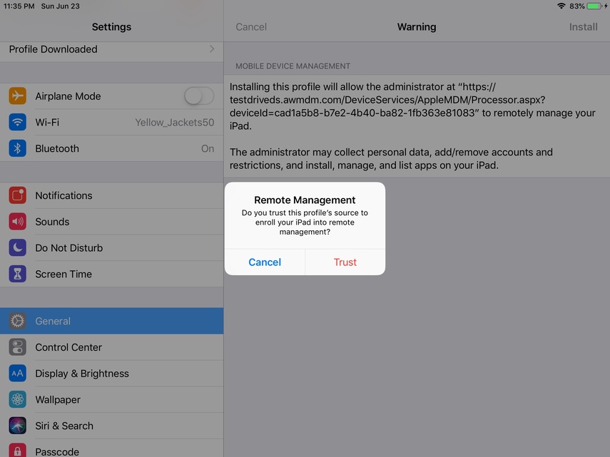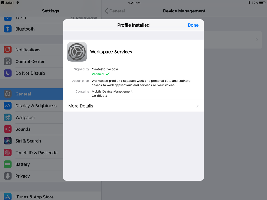 Navigate to 'Settings' on your device -> 'General' -> 'Profiles'. Install the Workspace Services profile to your device. With this profile, additional restrictions and profiles including certificates are being installed on your device.