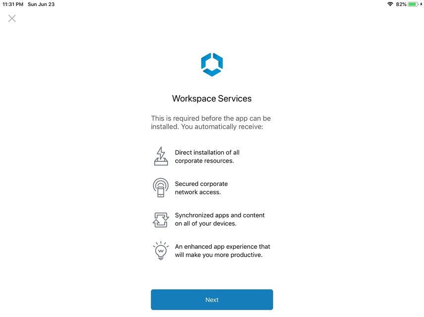 The user is informed that this app requires the Workspace Services profile. Click Next.