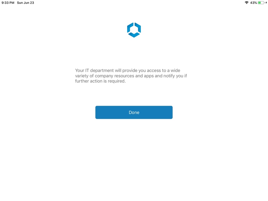 Once the profile is installed, navigate back to the Intelligent Hub. Click on 'Done' when enrollment is complete. Follow the steps to accept the Terms of Use and launch into the Intelligent Hub home screen.