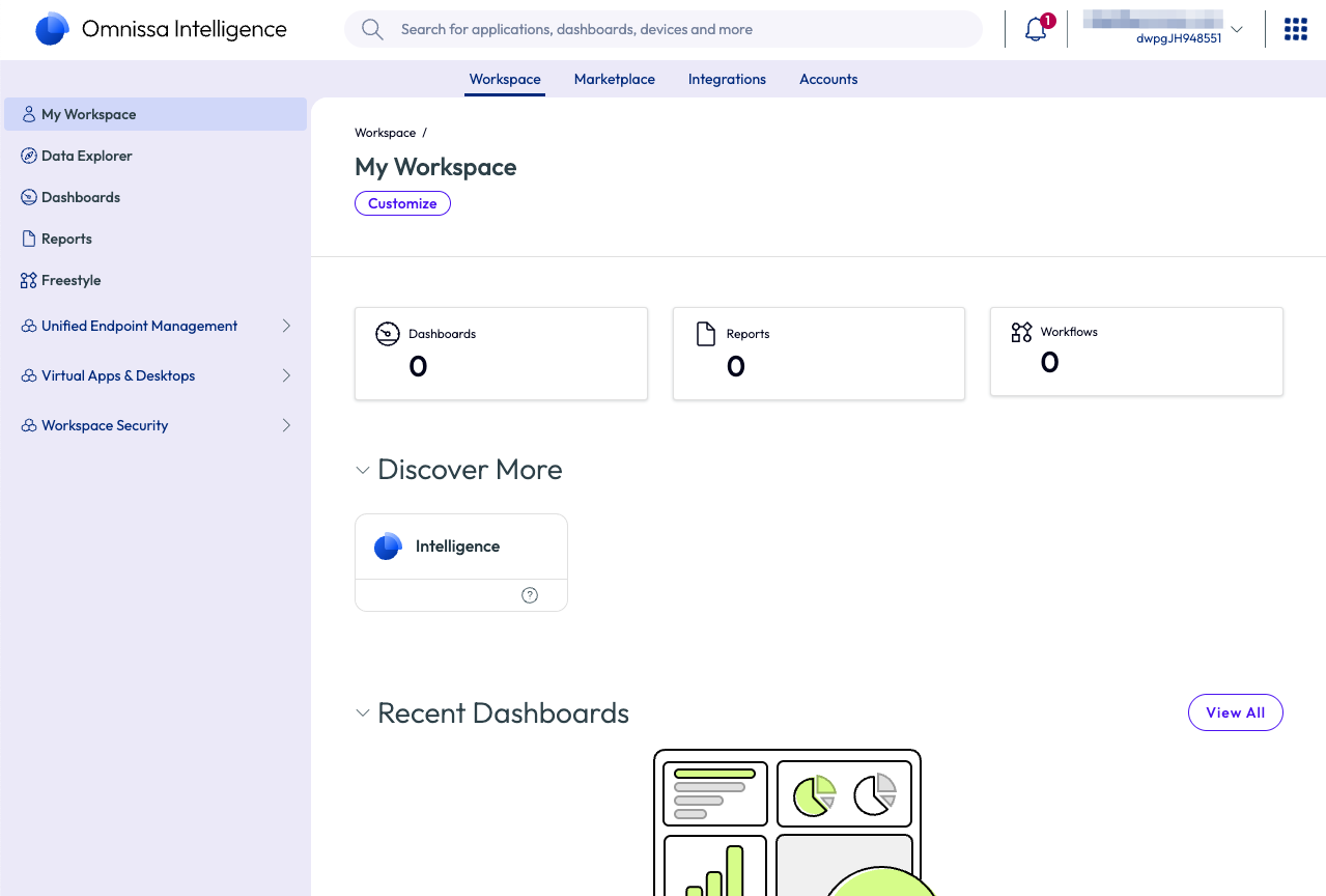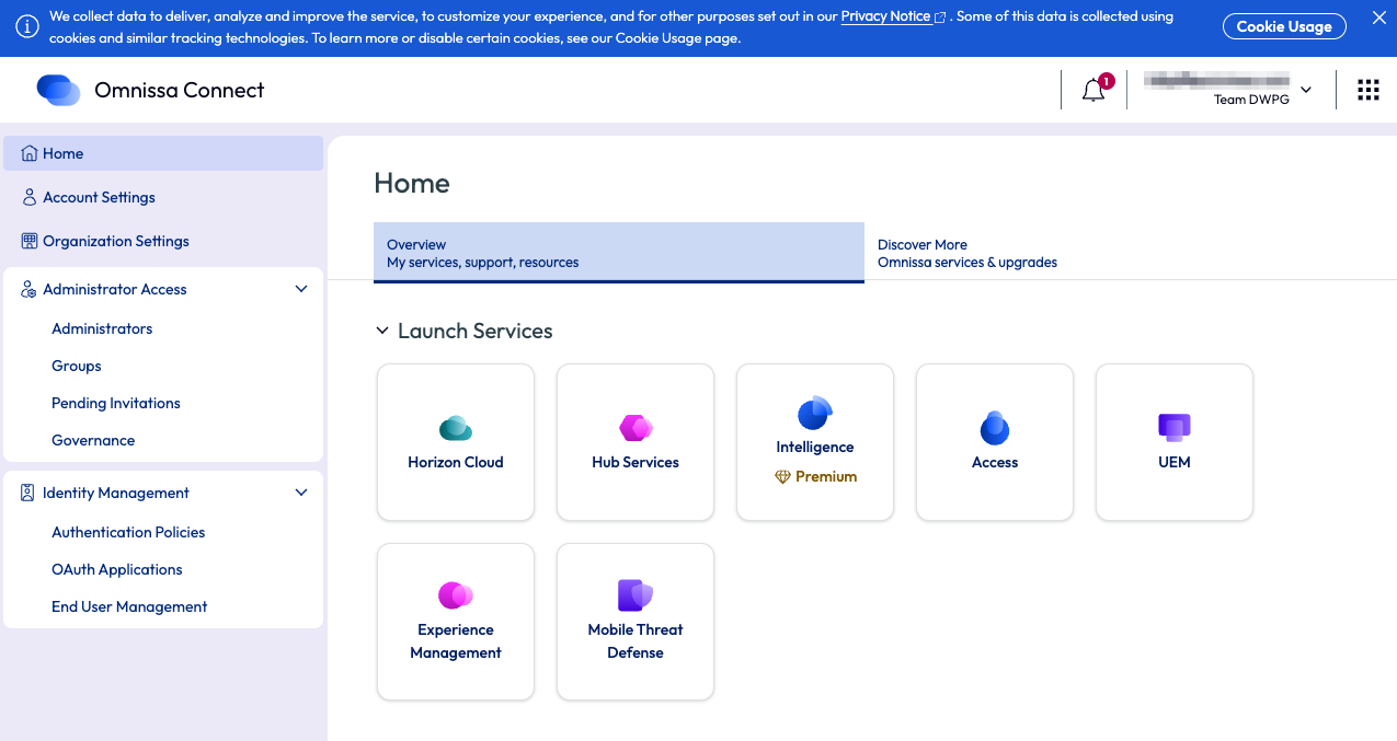 You should land in Omnissa Connect at the PG organization level. Pay attention to the notification bars at the top of the window as they may be relevant to your immediate experience.