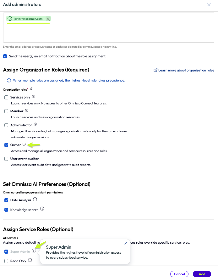 When adding the organization "Owner" role, "Super Admin" is automatically selected for all downstream services. You do not need to set individual service roles when adding an owner.