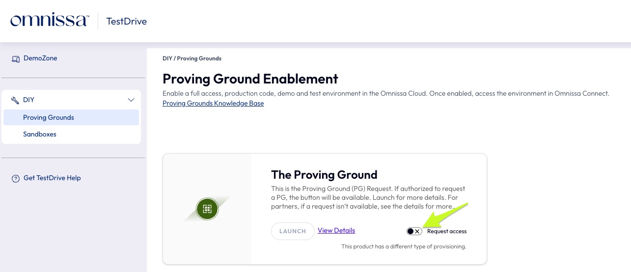 Go to DIY → Proving Grounds. TestDrive authentication is by Omnissa Connect. Use either SSO (all employees and federated partners) or your Omnissa Account.