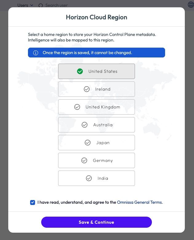 When Horizon Cloud is ready, upon first launch of Horizon Cloud, choose your region and agree to the Terms.