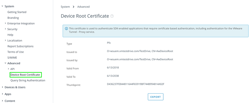 Before you begin to enroll devices in your Workspace ONE UEM sandbox, verify the Device Root Certificate is enabled.