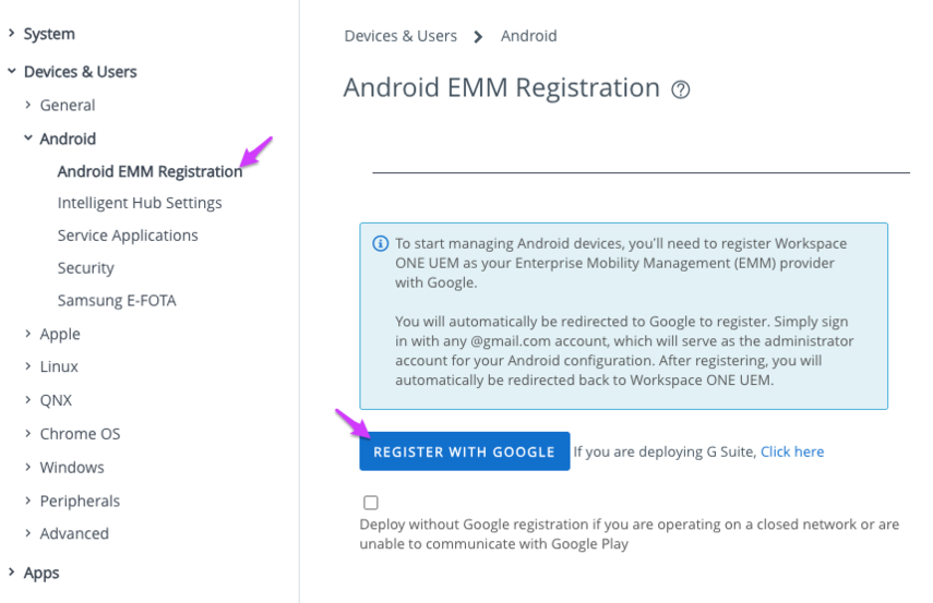 - Before enrolling Android, you must first configure Android EMM Registration in Workspace ONE UEM.