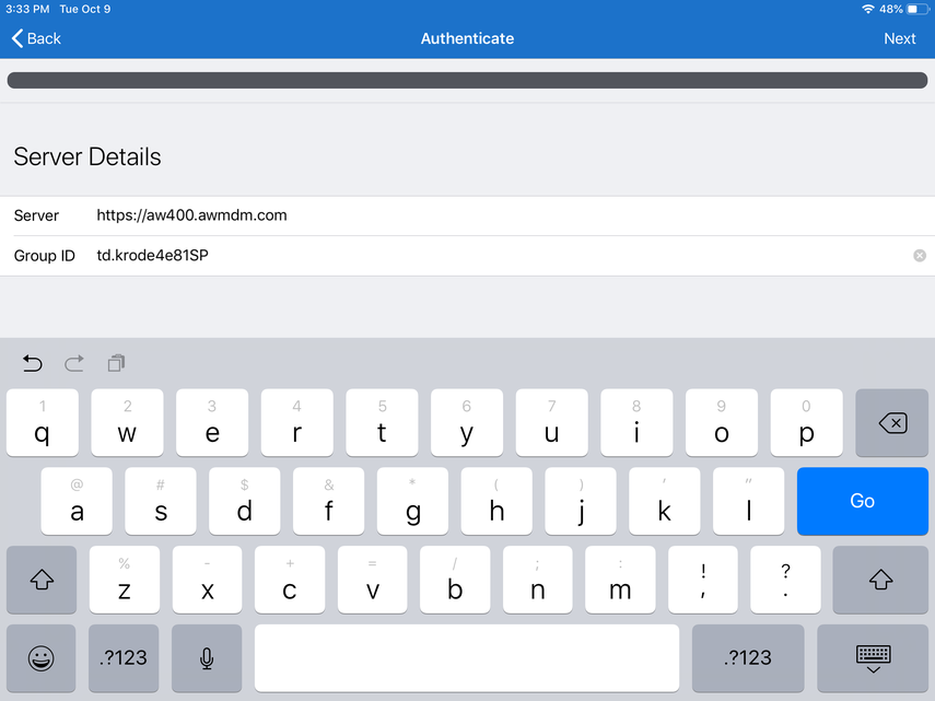 Enter your URL in the Server field, and then enter the Group ID. Click Next when finished.