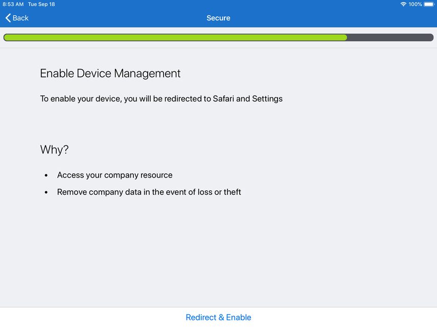 At the bottom of the screen select Redirect and Enable, which will open up a browser to begin installing the management profiles to your device.