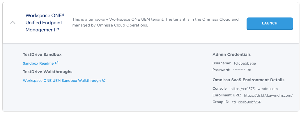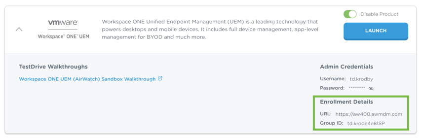 First, you'll need to identify the Group ID for your sandbox. This information is found under Enrollment Details in the expanded Workspace ONE UEM tile in the TestDrive portal.