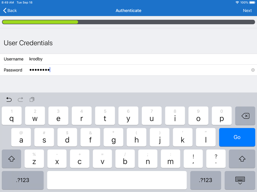 Next, you'll be brought to the User Credentials page. Enter the Username and Password for the user account you set up earlier. Click Next.