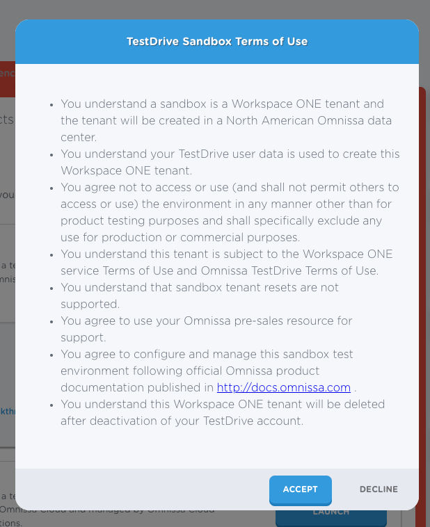 | Review and accept the TestDrive Sandbox Terms of Use. |